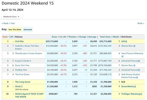 北好意思最新周末(4.12-4.14)票房出炉!亚历克斯·加兰(《消失》《机械姬》)导演新片《内战》北好意思首周末三天在3838馆,得益2571万好意思元票房,大大超出预期,创造A24影史最好北好意思开画成绩。这一成绩险些两倍于此前记载保合手者——2018年《遗传晦气》的1360万,也优于《拿破仑》(2060万好意思元)、《花月杀手》(2330万好意思元)等大型交易片的开画。