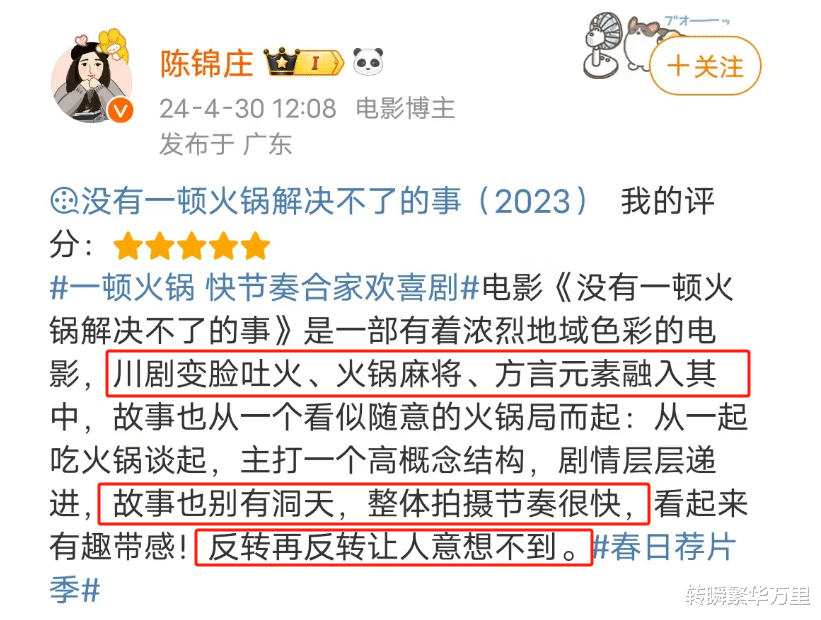 搭配着暖锅、川剧和麻将通盘食用,这方言简直越听越巴适,看完电影我齐念念好勤学一学了。