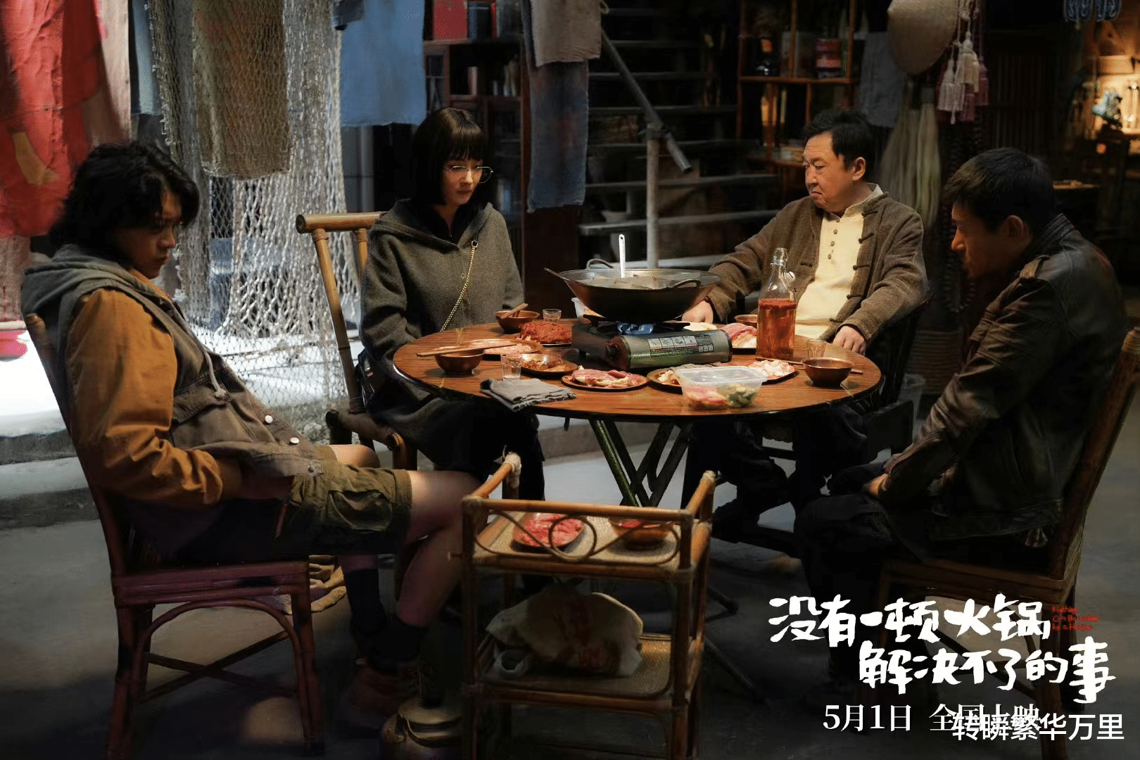 整部电影便是在一锅红油暖锅旁伸开的,当看到桌面上摆满了毛肚、辣牛肉、小酥肉,还有那一锅热辣翻滚、锅气喧天的红油汤底时,川渝味蹭一下就跃出屏幕了。