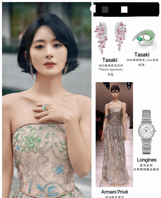 说罢了调和共赢,咱们再来聊聊先锋。红毯,向来是女明星们展现先锋品尝的进犯样子。此次,赵丽颖聘用了一袭Armani Prive 2024春夏高定投诚。这条抹胸长裙,预备简陋大方,却又处处透着细致。裙身点缀的亮片,在灯光下闪闪发光,映衬得赵丽颖愈加光彩照东说念主。Tasaki高等珠宝的搭配,更是一针见血,为合座造型增添了一抹浪费与优雅。整套造型仙气飘飘,齐全地展现了东方女性的柔好意思气质,仿佛是从画中走出来的青娥。