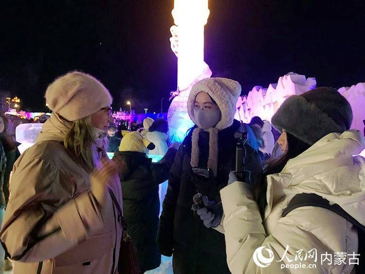 第二十二届中俄蒙海外冰雪节现场,东说念主民日报记者、东说念主民网记者采访俄罗斯搭客。实习生 牛佳摄