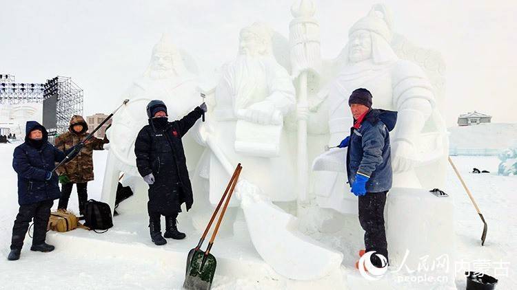 为冰雪主题乐土雕镂雪雕的贾师父团队,向记者展示完责任品。东说念主民网记者 张力洋摄