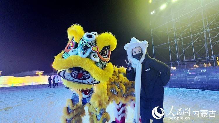 冰雪节现场的搭客和舞狮合影。东说念主民网记者 张力洋摄