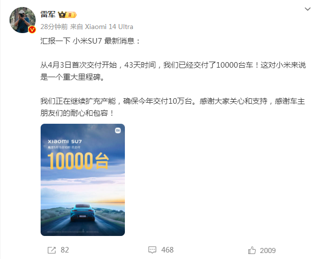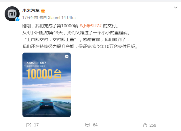 据小米汽车官方微博5月15日音书开云(中国)Kaiyun·官方网站 - 登录入口,小米汽车官宣:刚刚,咱们完成了第10000辆小米SU7的请托。从4月3日起的第43天,咱们又跨过了一个小小的里程碑。“上市即请托,请托即上量”,感谢有你,咱们作念到了!咱们还在抓续勤恳普及产能,保证完资本年10万台请托主义。
