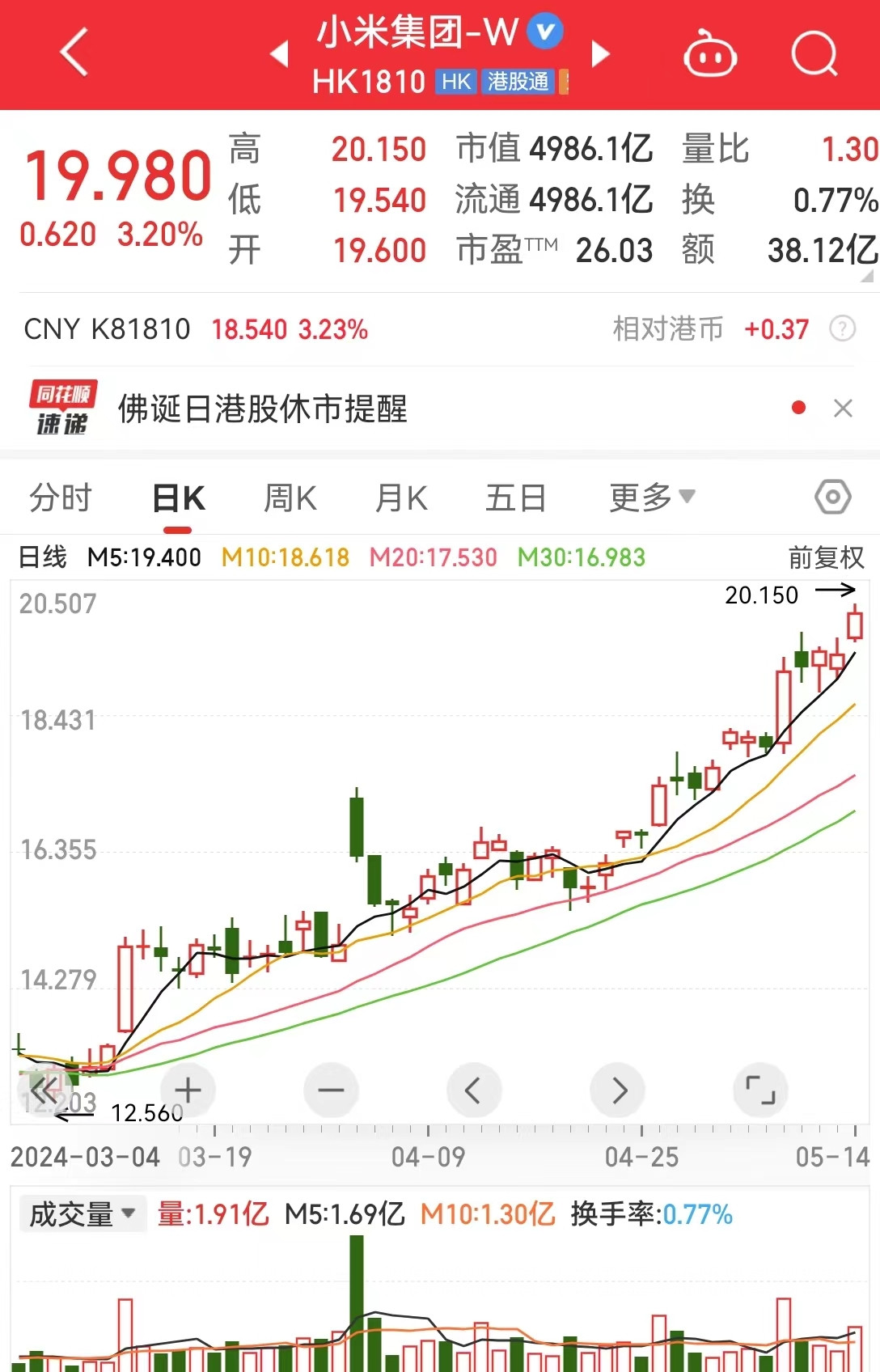 遗弃5月14日收盘,小米集团-W(HK1810)报19.98港元,当日涨幅3.20%,市值4986.1亿港元。