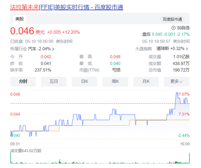 而继昨晚最新视频发布之后,限制好意思东时辰5月10日收盘,FF好意思股再度有所拉升,报价0.046好意思元,涨幅12.20%,总市值196.72万好意思元(约合东说念主民币1421万元)。