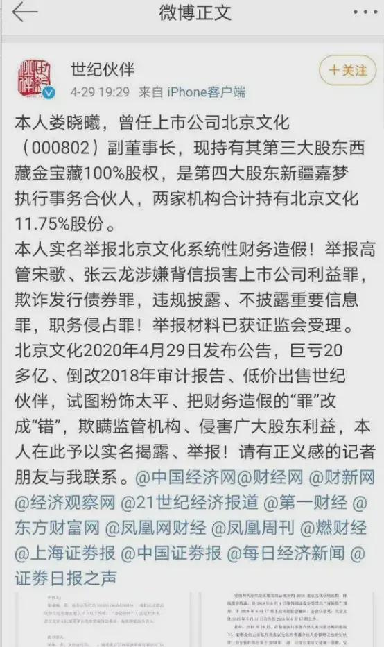 2020年4月,北京文化原副董事长娄晓曦在微博上实名举报了宋歌: