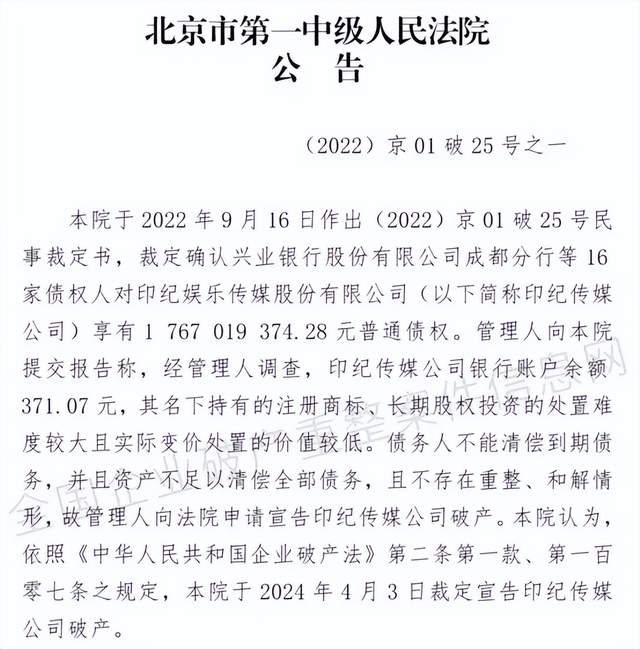 近日,曾经的影视文娱印纪文娱传媒股份有限公司(简称印纪传媒),公司银行账户余额仅剩371元,被法院裁定宣告停业。