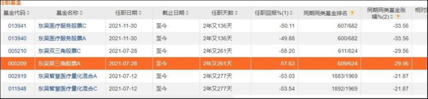 不外,在比年来博弈氛围浓厚的A股,医药也并非全然莫得契机,中药即是其中的例外;而毛可君的事迹,也不可全然归因为“运谈差”——事实上,由她搞定的基金莫得一支跑赢事迹比拟基准。Choice终局显现:2021年7月12日于今,东吴贤慧医疗量化羼杂A录得收益-53.03%,同期事迹比拟基准为-46.28%;2021年7月28日于今,东吴双三角股票A录得收益-57.63%,同期事迹比拟基准为-24.71%;2021年11月30日于今,东吴医疗作事股票录得收益-49.88%,同期事迹比拟基准为-49.01%。东吴贤慧医疗量化羼杂与东吴医疗作事股票均为医药主题基金,在设定的事迹比拟基准中,中证医疗指数占了较大权重,因此,基金净值的大幅下落,既受到了指数下行的影响,也和基金司理的选股才调联系。