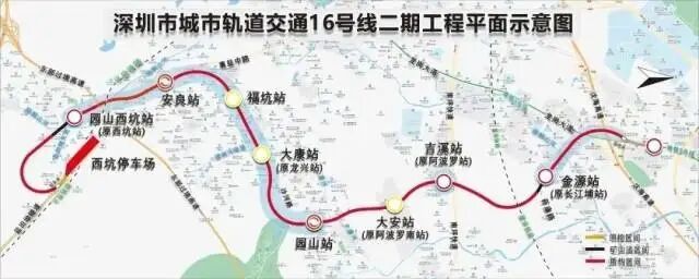 深圳地铁16号线二期工程起自既有16号线大运站,次第新设金源站、吉溪站、大安站、园山站、大康站、福坑站、安良站、园山西坑站8座车站,全长约9.46公里,设8座车站(含2座换乘站),西坑泊车场1座,全线给与地下敷设。