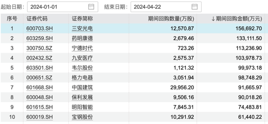 图为2024年股票回购金额名次前十个股(终结4月22日18时) 图片着手:Wind