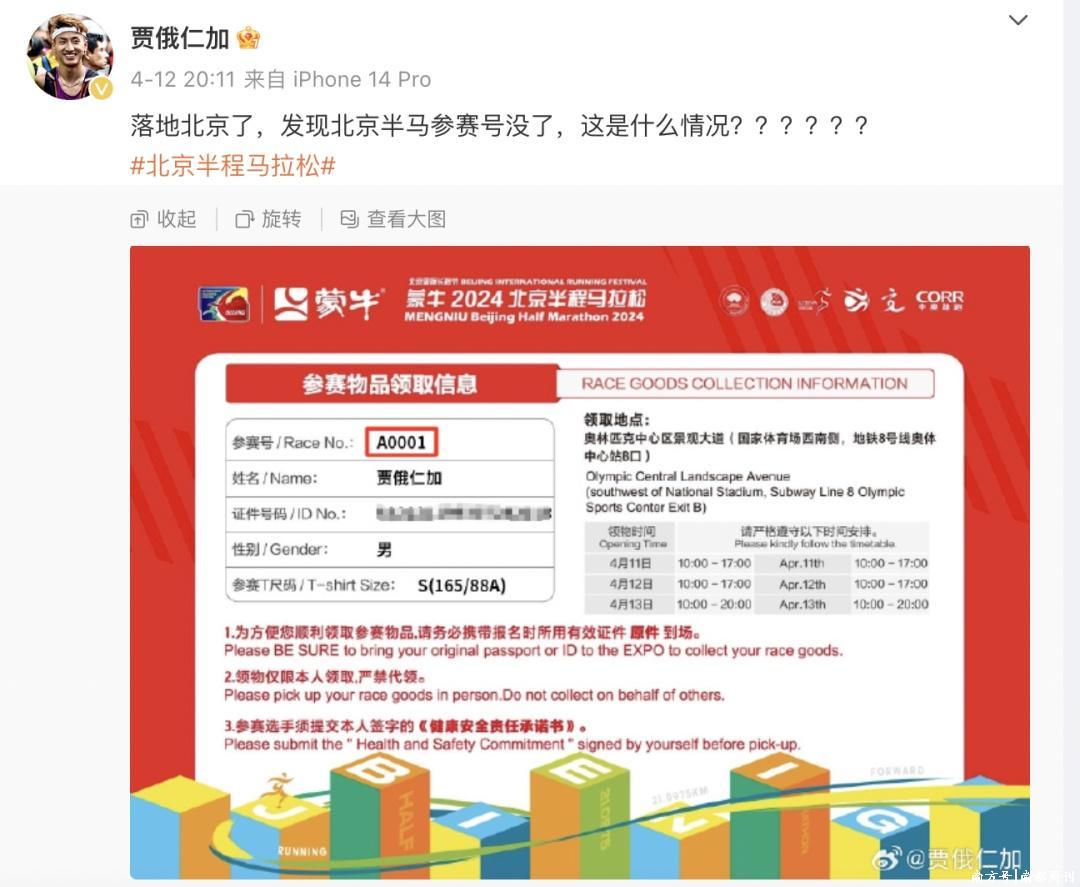 4月12日,北京半马开跑前日,国内马拉松选手贾俄仁加通过微博发声,称我方到了北京,却发现比赛限额被组委会取消。
