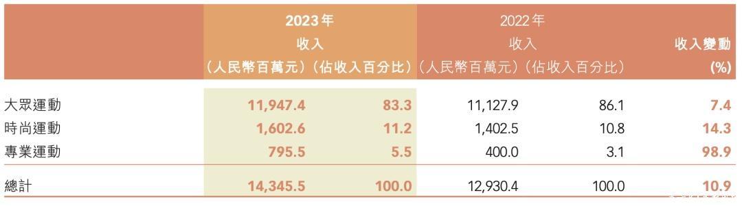 从财务数据看,特步增长出现赫然放缓。2023年报浮现,特步的营收增速从2021年、2022年的22.58%、29.15%,降至2023年的11.09%。其中,鞋履居品的营收占比从2022年的60%降至2023年的57%,增速仅有5.3%。