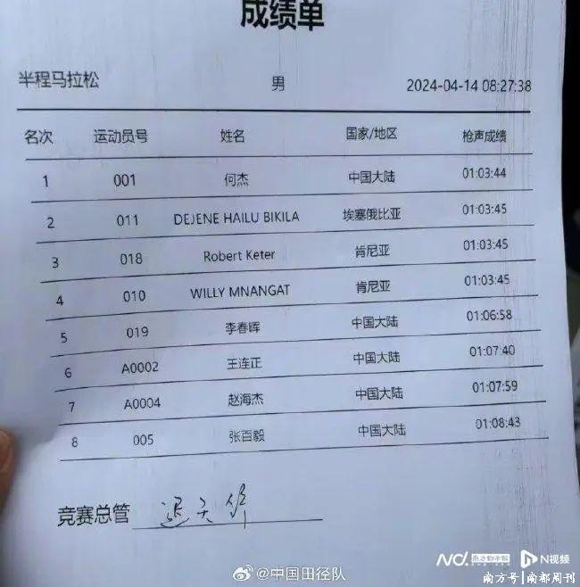4月14日,2024北京半程马拉松赛中,中国选手何杰以1小时03分44秒的得益夺冠。然而,现场画面浮现,何杰疑似被三名外籍选手专门放水“保送”冠军,激发不小争议。