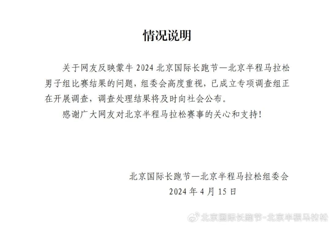 4月15日晚间,北京国际长跑节-北京半程马拉松组委会发布通报: