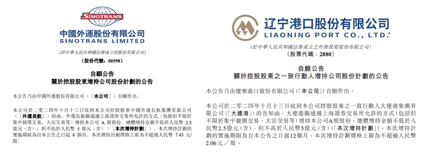 10月14日,招商局集团网站公布旗下8家上市公司集体回购增抓。其中,在AH两地上市的中外洋运(00598.HK)、辽港股份(02880.HK)均公告控股鼓舞拟最多增抓5亿元A股股份。