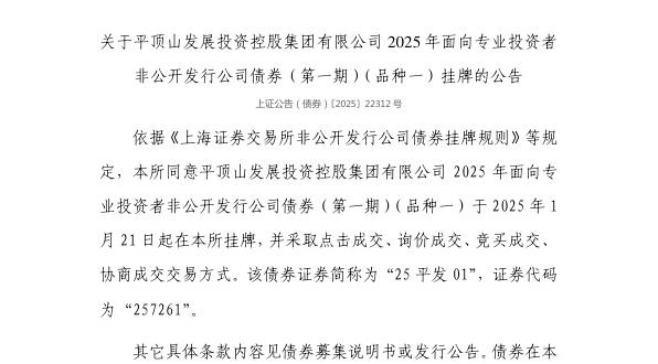 1月20日,上交所发布对于平顶山发展投资控股集团有限公司2025年面向专科投资者非公设立行公司债券(第一期)(品种一)挂牌的公告。