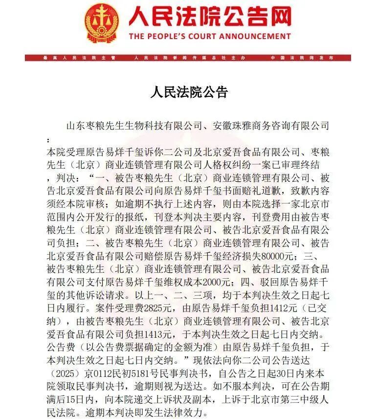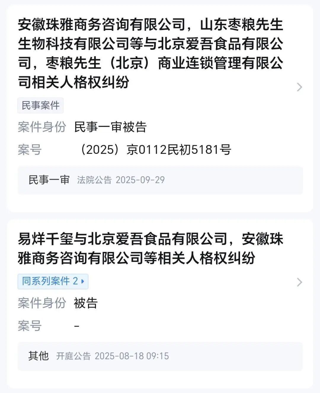 早在6月18日,通州区东说念主民法院向山东枣粮先生生物科技有限公司、安徽珠雅商务磋议有限公司投递传票和告状书副本等,称该院受理原告易烊千玺诉你二公司及北京爱吾食物有限公司、枣粮先生(北京)买卖连锁处治有限公司东说念主格权纠纷一案。原告告状条款:1、判令四被告立即罢手使用、销售并删除一切含有原告肖像及姓名的侵权物料,中止侵权步履;2、判令被告一北京爱吾食物有限公司在涉案洽商方位、四被告共同在《东说念主民法院报》向原告公开赔礼说念歉;3、判令四被告共同向原告补偿经济亏空算动500000元,维权老本合理开支5000元;4、本案诉讼用度由公告用度由四被告包袱。此案于2025年8月18日上昼9时15分在通州法院第三审判区第三十二法庭开庭审理此案。