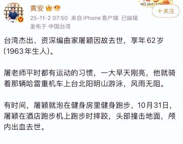 还铭记那一天许多东说念主王人禁受不了,但是这个低调的女东说念主连让别东说念主思要送她一程的契机王人不给,这么的一个演员真实令东说念主敬佩又缺憾。 在朱媛媛离世以后,又接连传来了不少明星离世的音讯,一个又一个的离世也给天下提了醒,还没从哀悼中走出来,近日音乐圈又传来不好的音讯,又又名东说念主走了。 音乐东说念主屠颖离世 前几天传来了屠颖离世的音讯,偶而许多东说念主不了解这一位,但有许多歌手的经典歌曲王人有他的影子,才华当然是没得说, 通过好友黄安的发文了解到了他的离世原因,真实让东说念主唏嘘!这大要等于“阎王让东说念主三更走你活不外五更”。