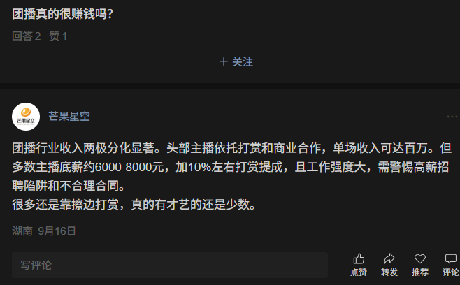 主营娱乐业务的湖南芒果星空公司曾暗示,“团播行业收入南北极分化权贵。头部主播依托打赏和买卖协作,单场收入可达百万。但多数主播底薪约6000-8000元,加10%驾驭打赏提成,且使命强度大,需警高薪招聘罗网和分歧理合同。”