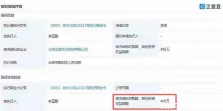 2025年10月,两东说念主终于官宣仳离,孩子侍从母亲生活。而只是两个月后,李亚鹏又传来公司股权被冻结的音问。这笔百万元的欠税,对时时东说念主来说或者是天文数字,但对还是代言费千万的李亚鹏来说,却成了压垮他的又一根稻草。
