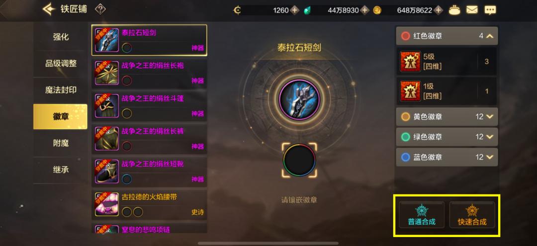 和徽章的镶嵌相通,合成玩法也不错在同界面里怒放。需要夺方针是,无为合成所以一次合成一个徽章为筹办。快速合成则是用于批量一次性合成多数徽章使用。一般咱们用无为合成。