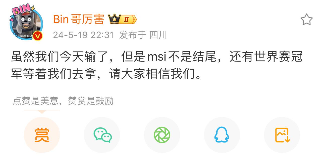 Bin赛后发文如下,暗示:天然MSI决赛输了,但这不是驱逐,还有寰宇冠军在等着咱们,但愿寰球投诚咱们!