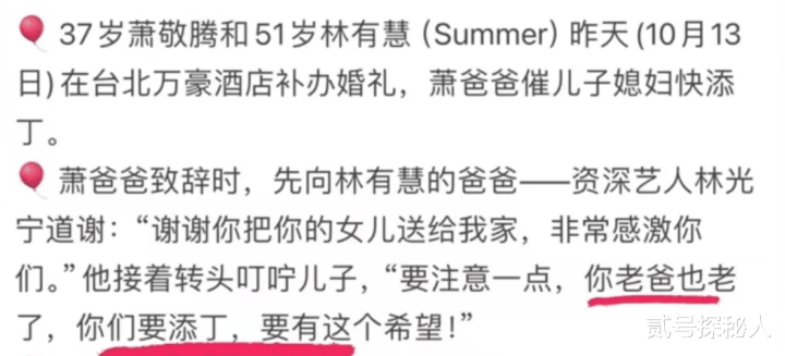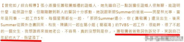 在婚典祝词时,萧敬腾的父亲先是感恩了林有慧的父亲,后又直言: