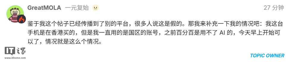 IT之家 10 月 27 日音书开yun体育网,音书源 GreatMOLA 今天在 Linux Do 论坛发文,称我方的港行苹果 iPhone 手机从今天早上不错下载 Apple 智能模子,启用后发现照实不错使用。