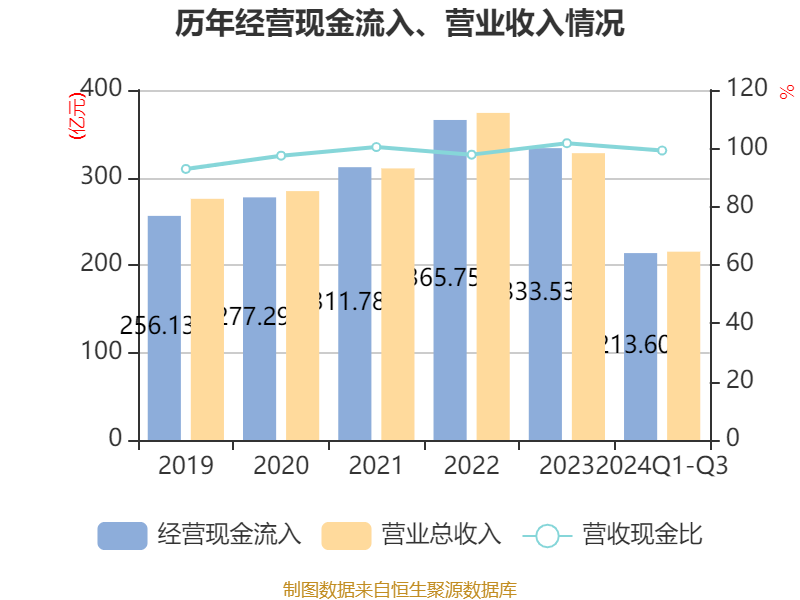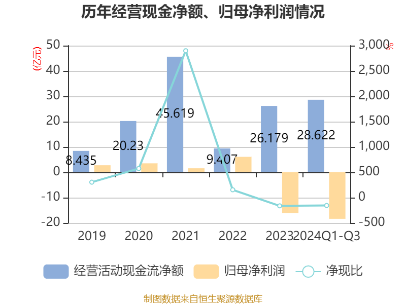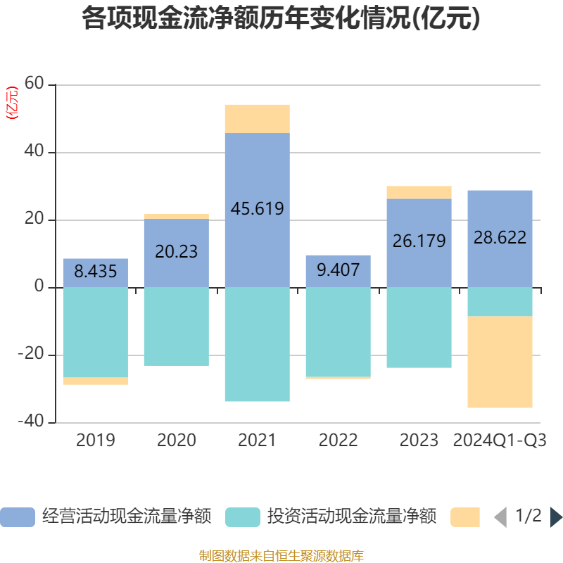 2024年前三季度,公司策动四肢现款流净额为28.62亿元,同比增长444.33%;筹资四肢现款流净额-27.03亿元,同比减少47.39亿元;投资四肢现款流净额-8.66亿元,上年同时为-16.14亿元。