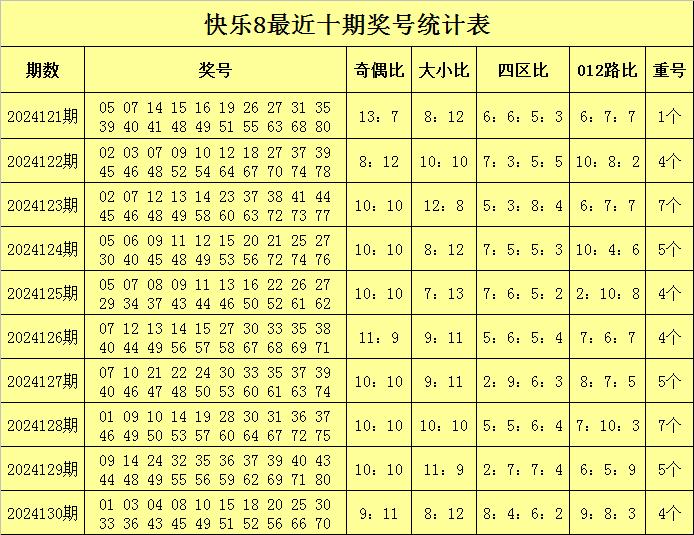 福彩疯狂8第2024130期开奖回来:01 03 04 08 10 15 18 20 25 30 33 36 43 45 49 51 52 56 66 70,其中奖号奇偶比为9:11,大小比为8:12,四区比为8:4:6:2,012路比为9:8:3,重号4个:36、43、49、56。